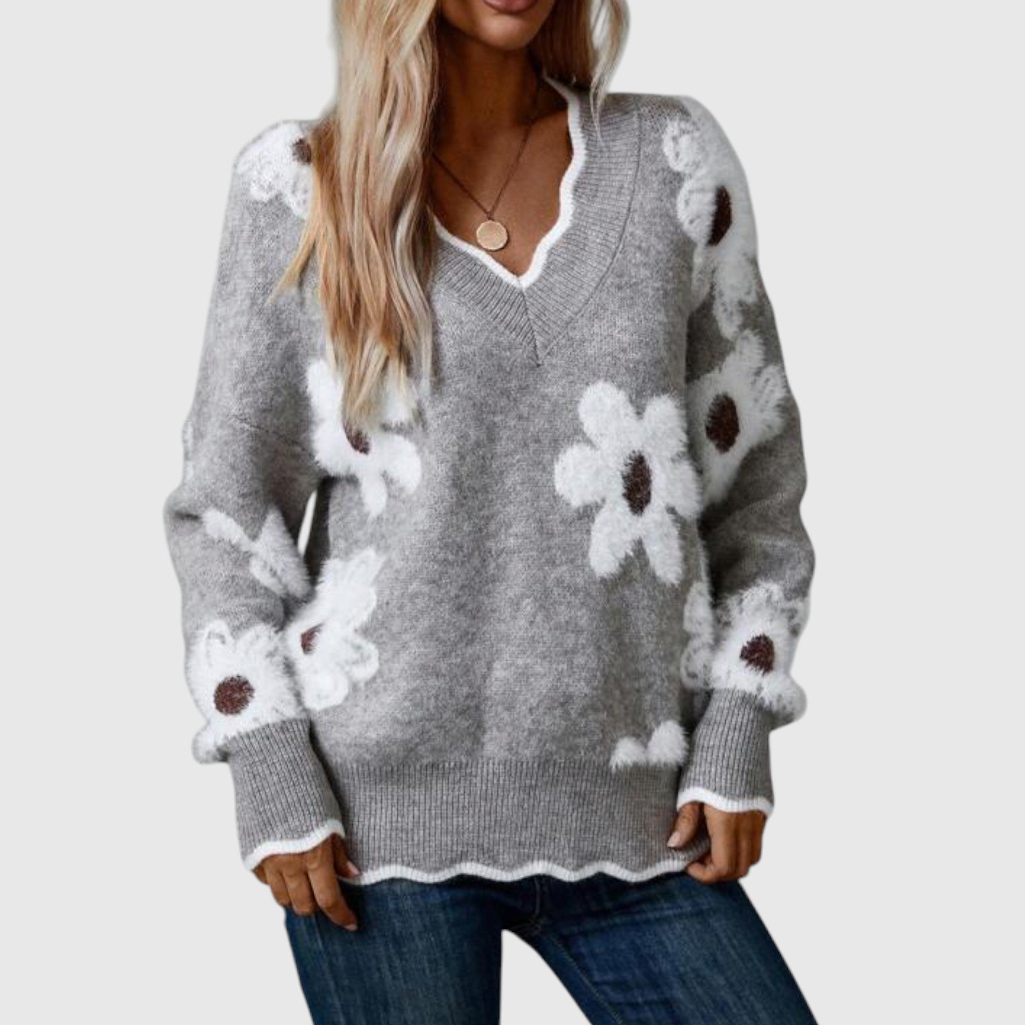 Svetřík Thea kombinuje útulné pohodlí s nenucenou elegancí, díky čemuž je výjimečnou volbou pro chladnější dny. S lichotivým V-šímkem a elegantním květinovým vzorem přináší kouzlo a sofistikovanost do vašeho každodenního šatníku. Měkký, lehký a snadno nositelný, Thea vás zahřeje, aniž by vás zatížil — ideální pro neformální chvíle i elegantní příležitosti.