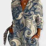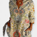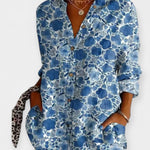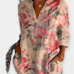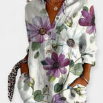 Lehká a romantická blůza s decentními květinovými vzory a klasickým zapínáním na knoflíky, ideální na jaro a stylové outfity.