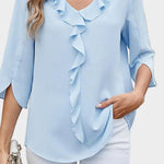 Seznamte se s Modrou Volánkovou Košilí – oděvem, který spojuje eleganci a pohodlí. S ženským střihem a jemnými detaily se stává ideální volbou jak pro každodenní nošení, tak pro upravenější outfity.