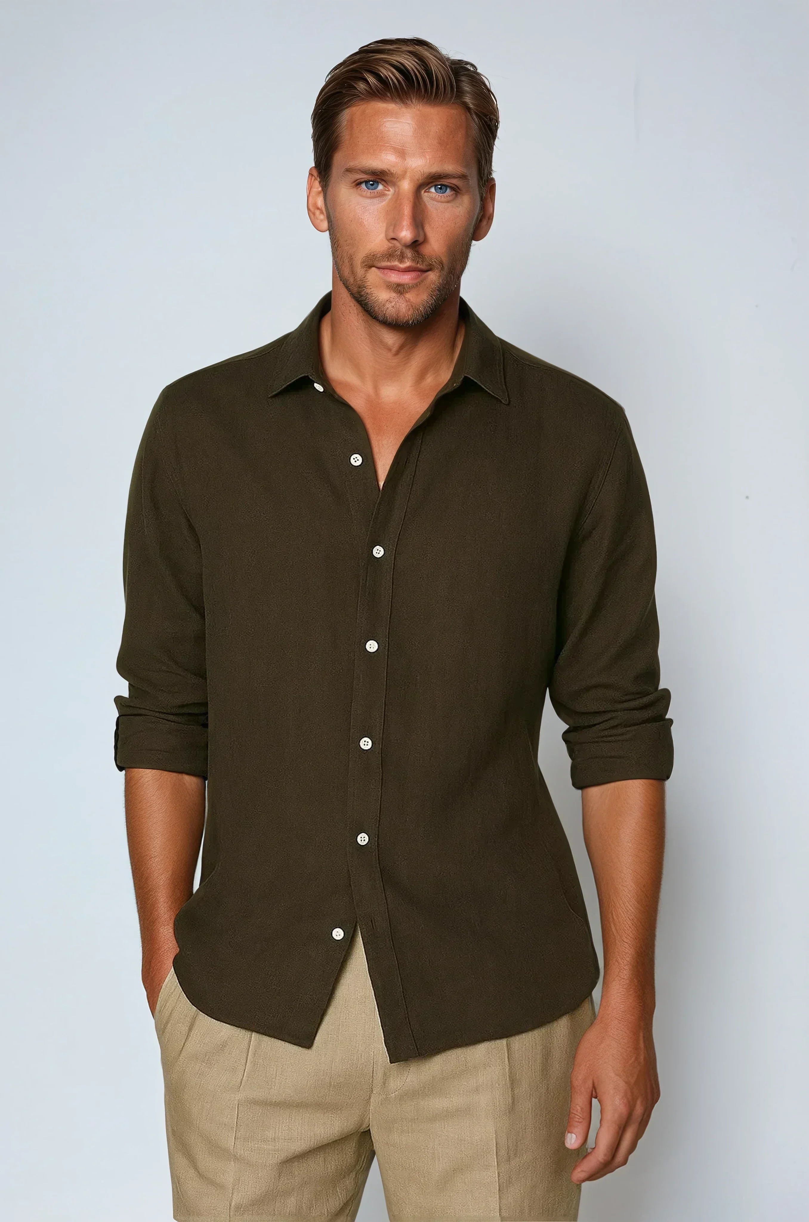 Objevte rafinovaný styl Lněné Košile Tmavě Hnědé od Grand Arbre. Tato elegantní košile kombinuje komfort, luxus a všestrannou barvu, ideální pro muže, kteří hledají kousek oblečení, který je jak stylový, tak prodyšný. Ideální pro jakékoliv příležitosti, od neformálních po poloformální.
