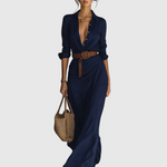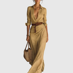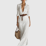 Elegantní dlouhé šaty charakterizované klasickým designem s límečkem, dlouhými rukávy a jednoduchým zapínáním na knoflíky. Pas s páskem zvýrazňuje vaši siluetu pro rafinovaný a ženský vzhled.