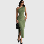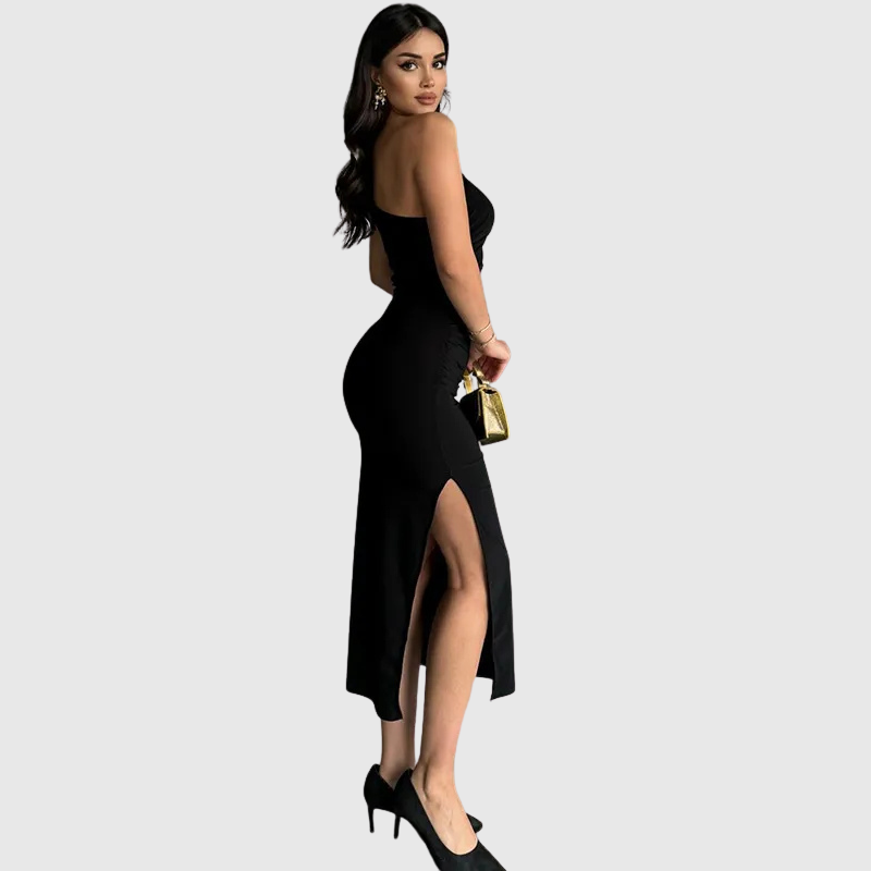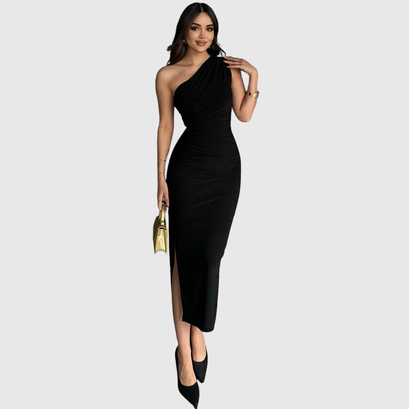 Ať už míříte na koktejlovou party, nebo na elegantní večer, šaty Kaia zajistí, že všechny pohledy budou upřeny na vás. Vyrobeny z hladké, lichotivé látky, tyto kotníkové šaty s jedním odhaleným ramenem a jemnými záhyby zvýrazní vaše přirozené křivky při každém kroku.