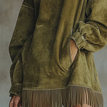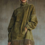 Tyto olivové rolákové šaty z umělého semiše spojují pohodlí s moderním designem. Luxusně hebký materiál působí hřejivě a elegantně, zatímco volný střih a výrazné třásně dodávají outfitu lehkost a pohyb. Ideální volba pro ženy, které chtějí vyniknout stylově a bez námahy – ať už během dne, nebo při neformálních setkáních.