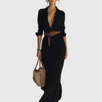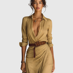 Elegantní dlouhé šaty charakterizované klasickým designem s límečkem, dlouhými rukávy a jednoduchým zapínáním na knoflíky. Pas s páskem zvýrazňuje vaši siluetu pro rafinovaný a ženský vzhled.